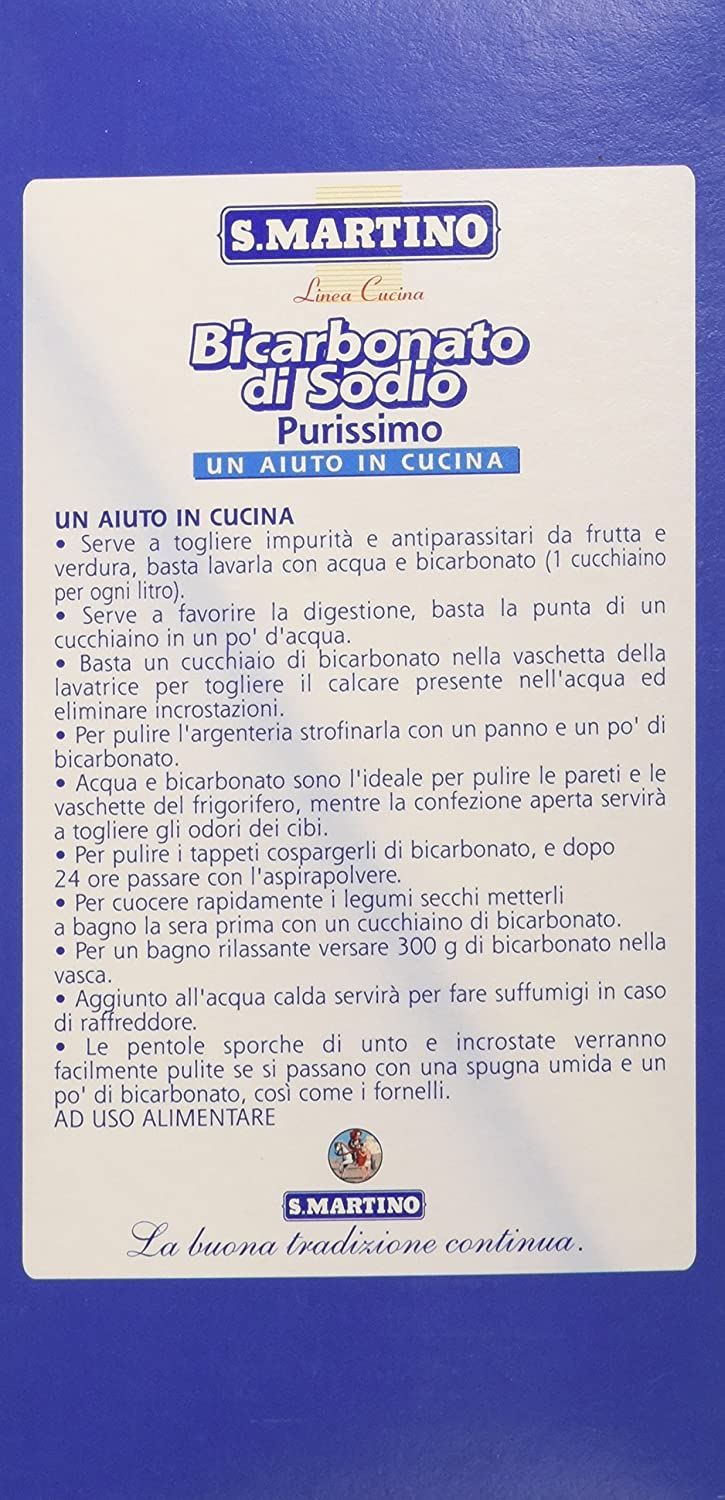 Bicarbonato di sodio, dai molteplici usi in cucina. Sul retro dell'astuccio si trovano utili consigli per utilizzarlo in vari modi.