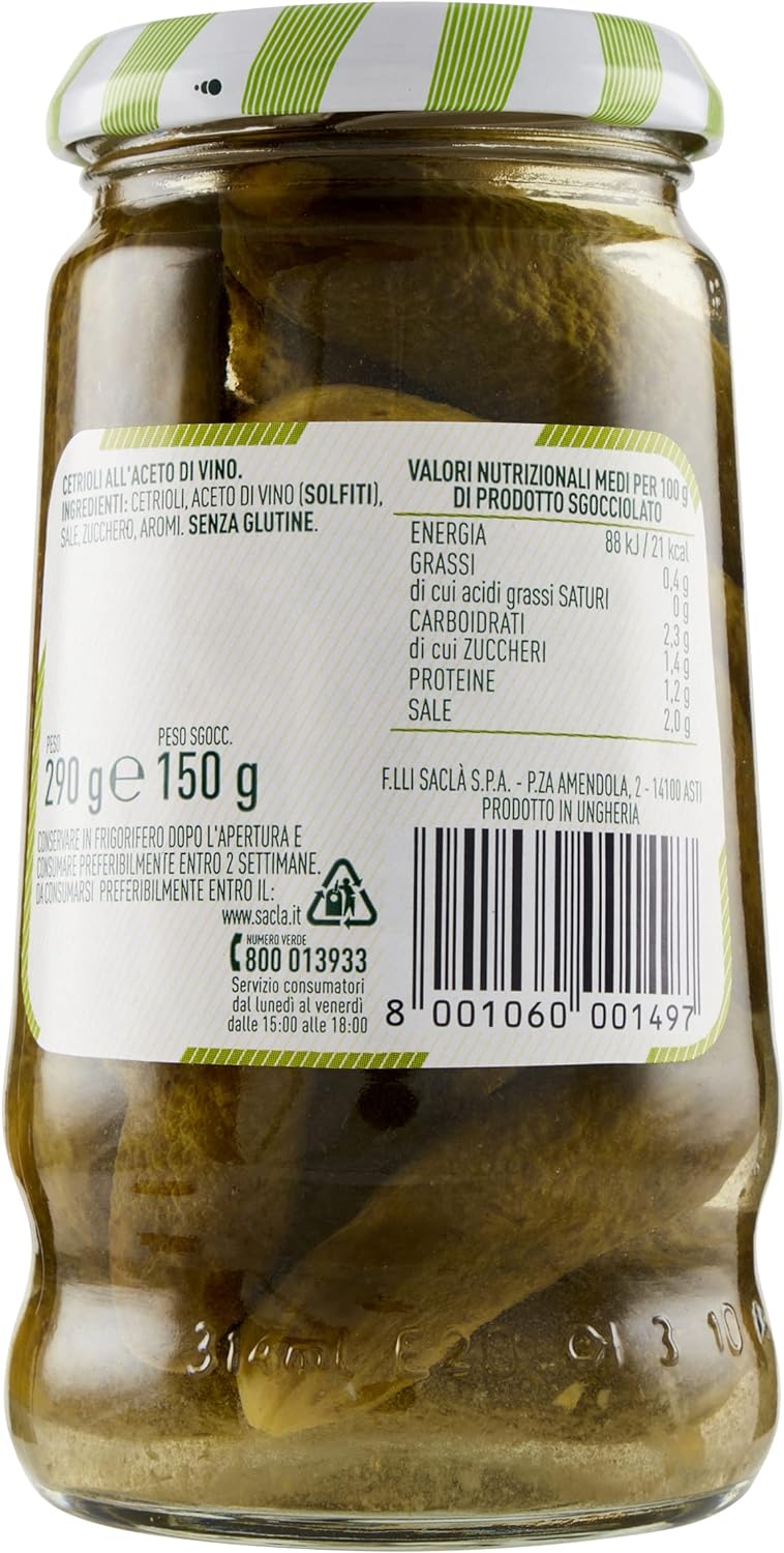 Prova i Cetrioli all'aceto di vino della linea Acetelli Saclà. Lavorati con cura e passione dalla coltivazione al confezionamento, i Cetrioli Acetelli Saclà sono lavorati dal fresco e contengono ingredienti selezionati e di prima qualità. Ideali per arricchire aperitivi, antipasti e insalate, per te e per chi ami. Confezione da 12 pezzi, conservati in vetro da 290g (150g sgocciolato).