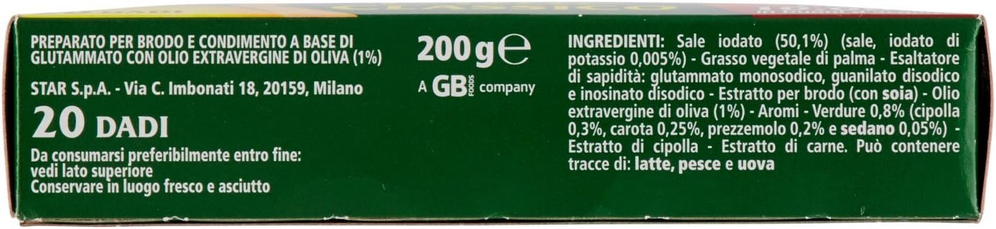 Sale iodato (50,1%) (sale, iodato di potassio 0,005%), Grasso vegetale di palma, Esaltatore di sapidità: glutammato monosodico, guanilato disodico e inosinato disodico, Estratto per brodo (con SOIA) , Olio extravergine di oliva (1%), Aromi, Cipolla, Carota , Prezzemolo, Estratto di cipolla , SEDANO. Può contenere tracce di: UOVA.