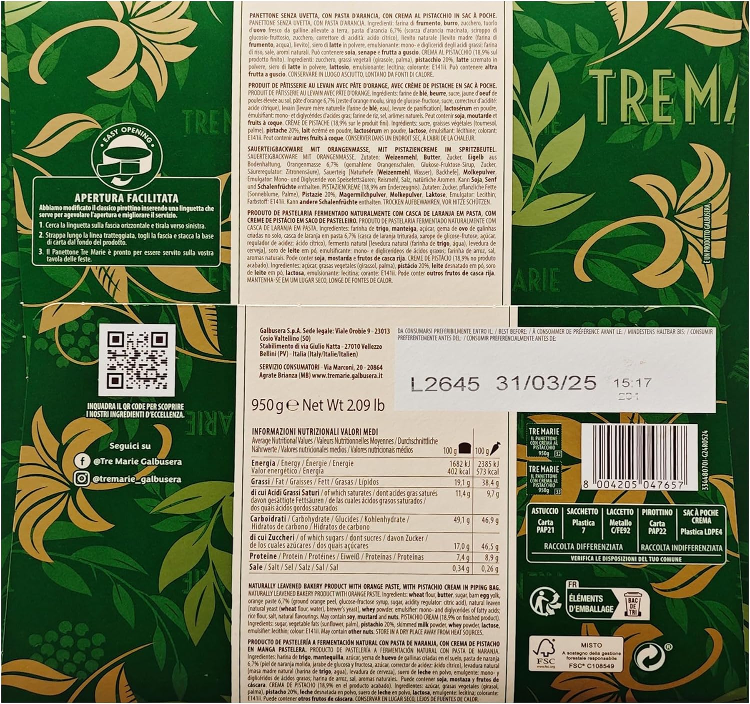 PANETTONE SENZA UVETTA, CON PASTA D'ARANCIA, CON CREMA AL PISTACCHIO IN SAC À POCHE. PANETTONE SENZA UVETTA, CON PASTA D'ARANCIA. Ingredienti: farina di frumento, burro, zucchero, tuorlo d'uovo fresco da galline allevate a terra, pasta d'arancia 6,7% (scorza d'arancia macinata, sciroppo di glucosio-fruttosio, zucchero, correttore di acidità: acido citrico), lievito naturale [lievito madre (farina di frumento, acqua), lievito], siero di latte in polvere, emulsionante: mono- e digliceridi degli acidi grassi, farina di riso, sale, aromi naturali. Può contenere soia, senape e frutta a guscio. CREMA AL PISTACCHIO (18,9% sul prodotto finito). Ingredienti: zucchero, grassi vegetali (girasole, palma), pistacchio 20%, latte scremato in polvere, siero di latte in polvere, lattosio, emulsionante: lecitina; colorante: E141ii. Può contenere altra frutta a guscio. CONSERVARE IN LUOGO ASCIUTTO, LONTANO DA FONTI DI CALORE.