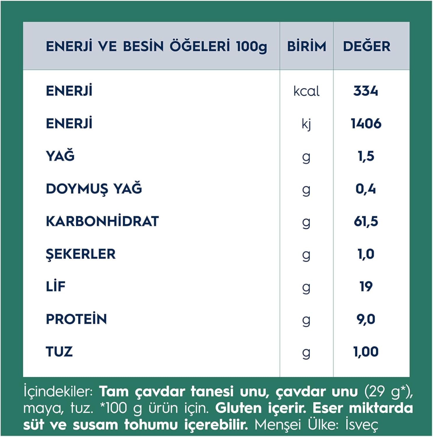 farina integrale di SEGALE, farina di SEGALE (29 g) lievito, sale.